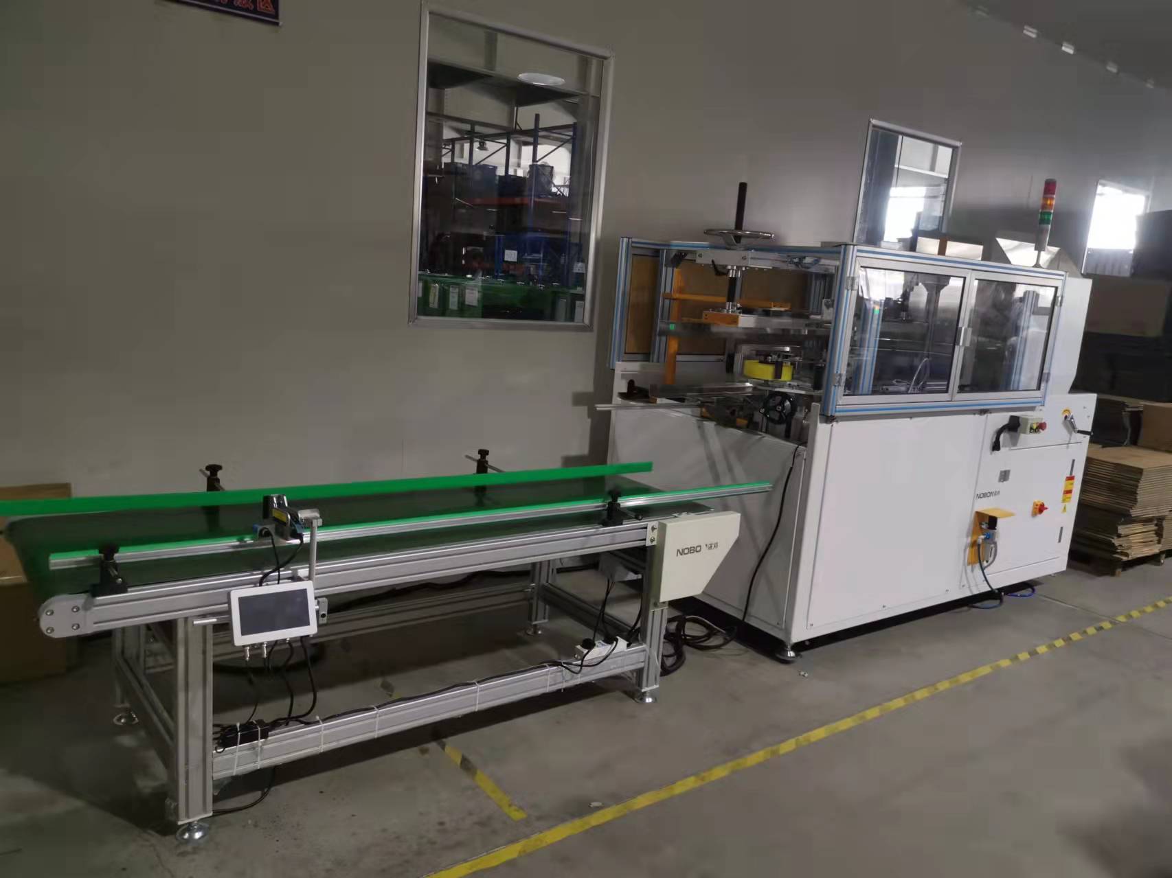 自動開箱機自動完成開箱、成形、下底折葉折曲.并現時完成下部分膠帶粘貼,開箱機將疊成紙板的箱板自動打開,箱子底部按一定程序折合,并用膠帶封好后輸送給裝箱工位的專用機器人設備。